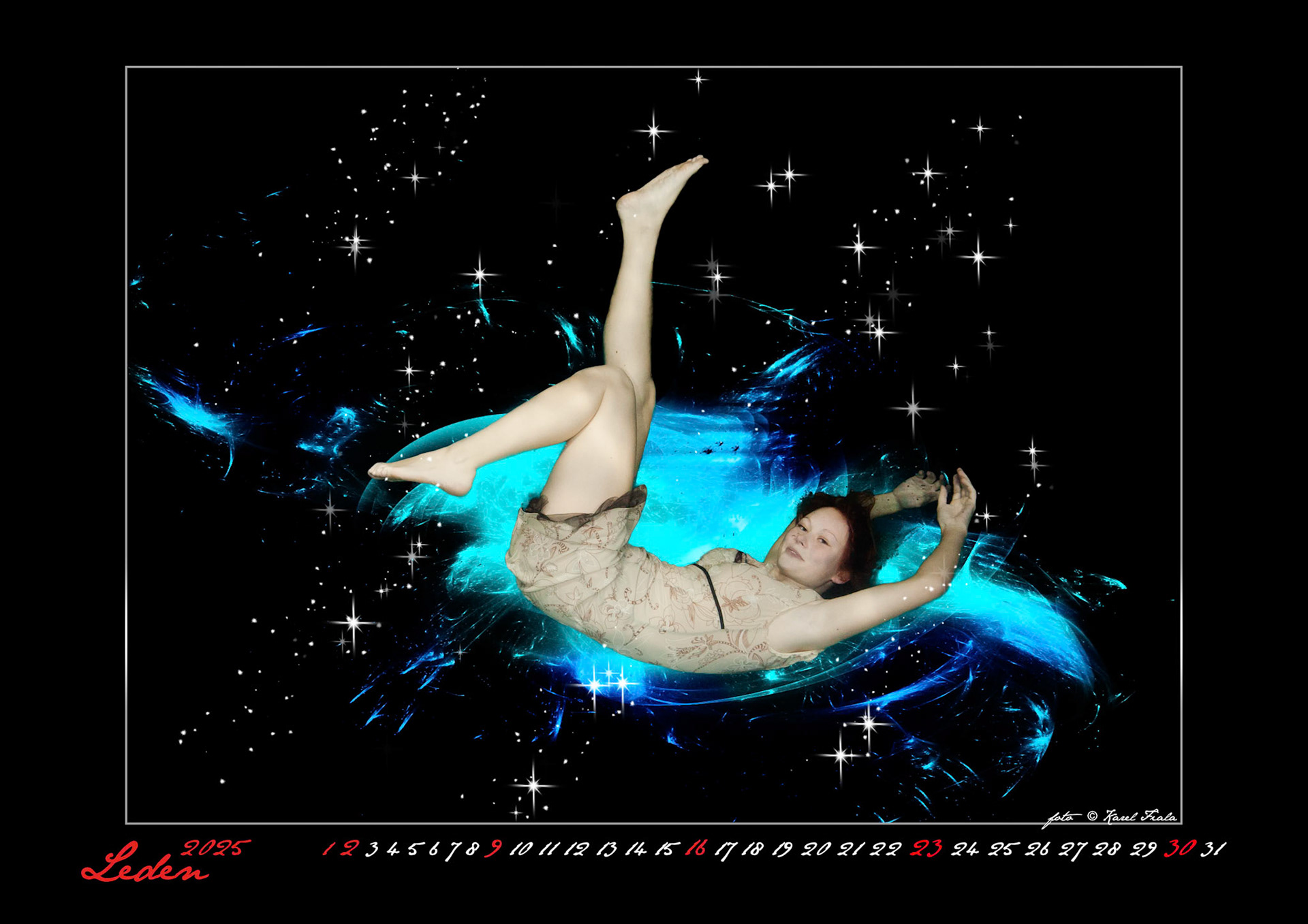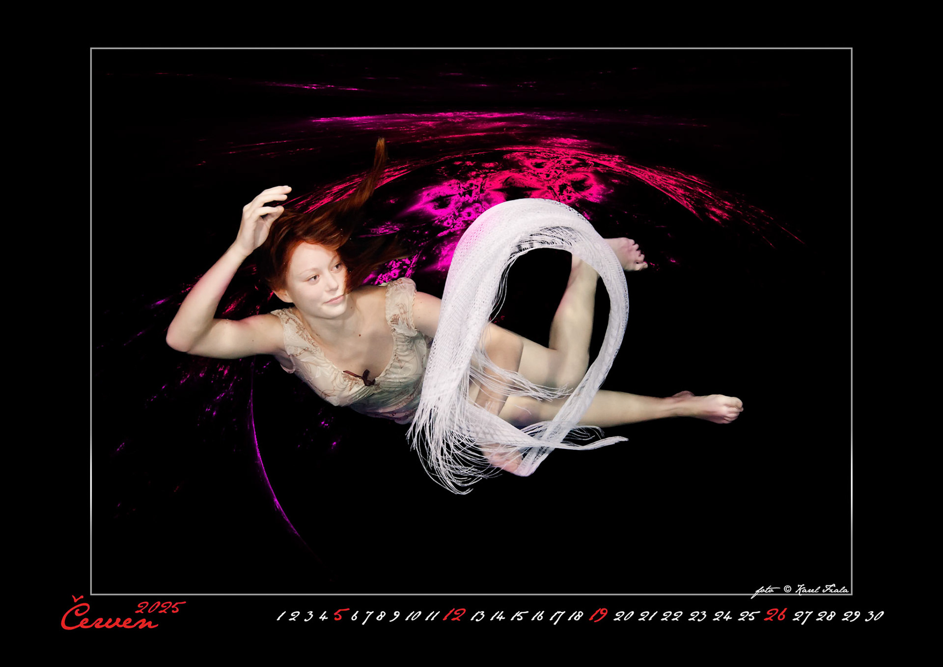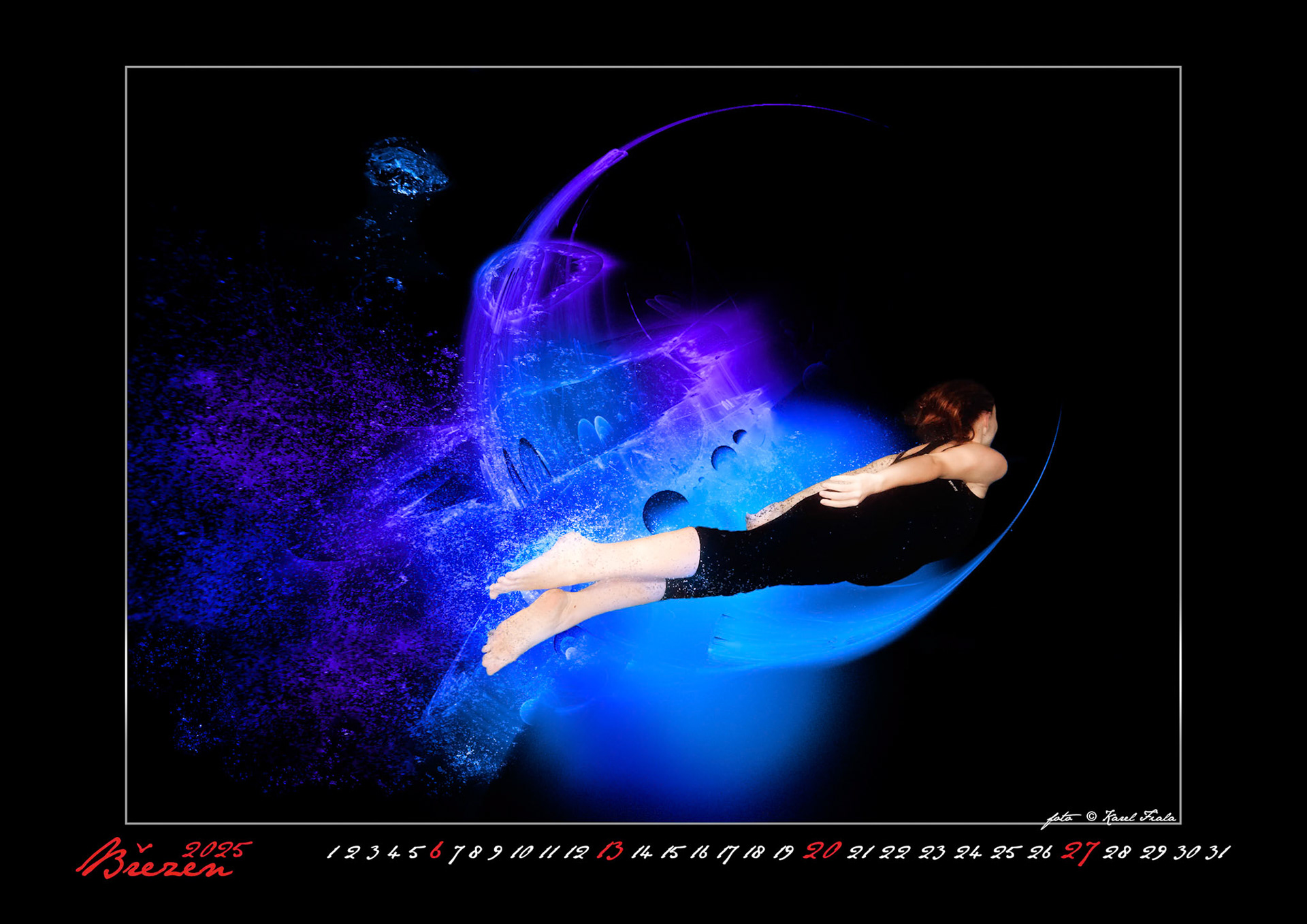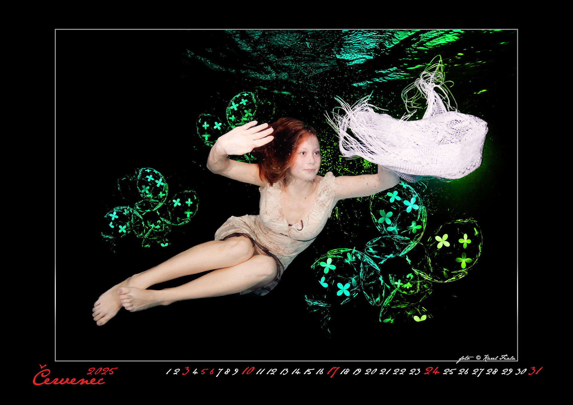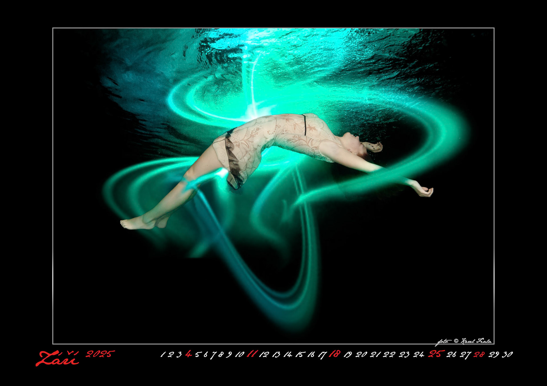Tato série dvanácti autorských fotografií vznikla jako unikátní osobní projekt a kalendář. Modelka se vznáší v temnotě pod hladinou, zatímco prostor za ní ožívá světelnými efekty inspirovanými polární září. Každý snímek kombinuje eleganci šatů a spodního prádla s beztížným stavem, čímž vytváří snovou až nadpozemskou atmosféru.