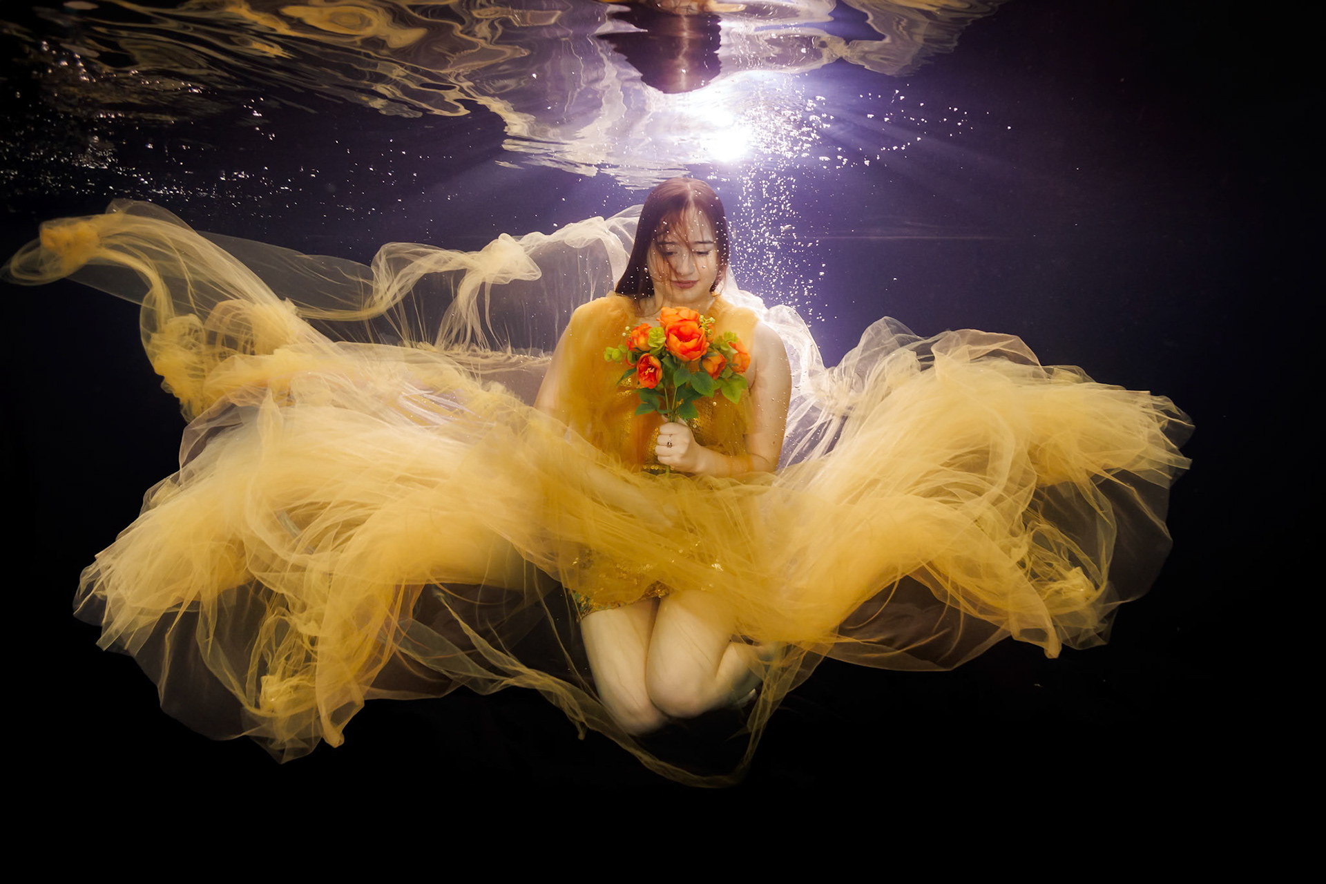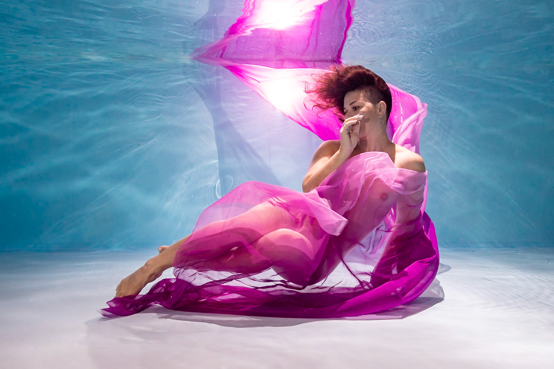 Individuální VIP podvodní focení zaměřené na portrét, emoci a styl. Klidná práce s tělem, světlem a prostorem pod vodní hladinou.